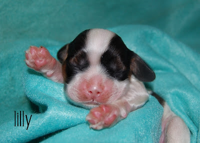 As I was on the phone with them Petunia was born. I laughed as I hung up with them. Daphne likes to torment me sometimes. And she knows just what to do to get me flustered. Anyway Petunia surprised me. She looked too dark to be a sable parti. As I examined her closely I was sure she was a black and white tri. Tri because I could see some tan on her cheeks. That was a new color. We never had that one before. Her markings were nice as well and I was pleased.